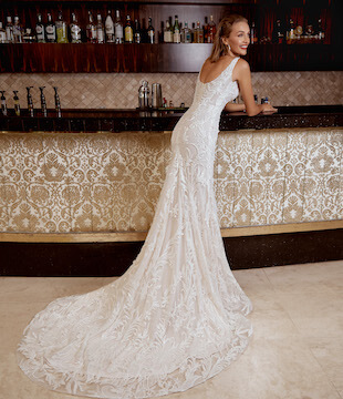 Wedding dresses designed in the sheath or column style are simultaneously classic and trendy. They fall straight from a fitted waist and are more tailored to your body type. Sheath bridal gowns offer an understated elegance, usually constructed with lightweight fabrics that allow the dress to drape beautifully over a bride’s body.